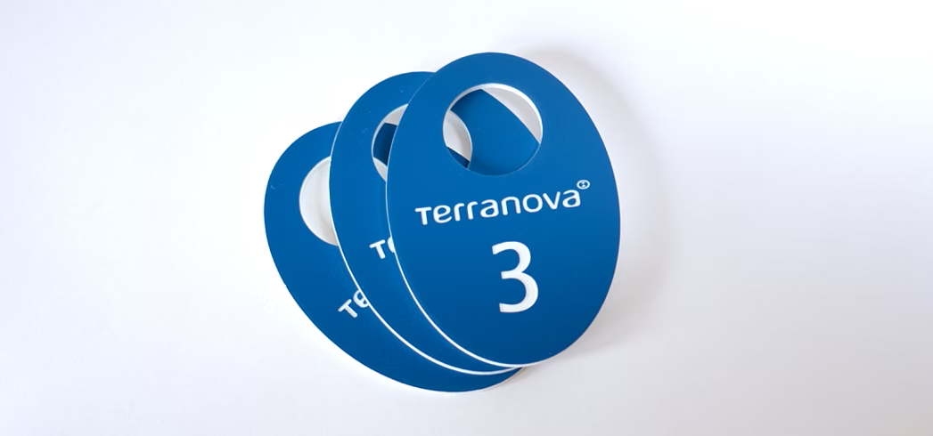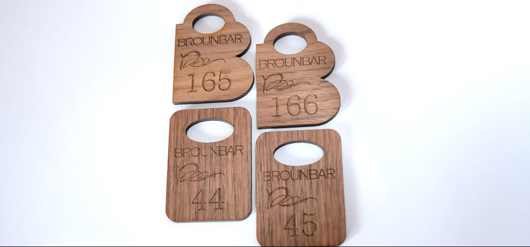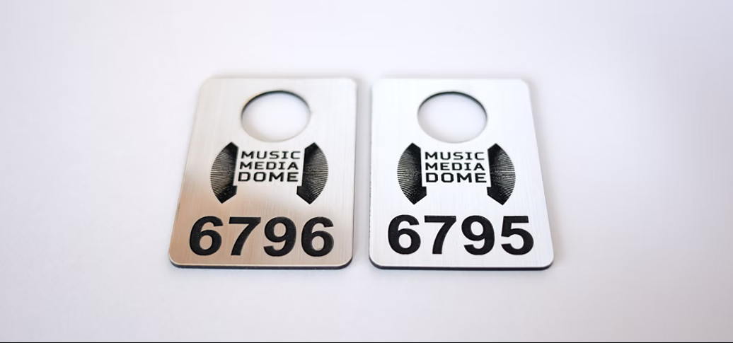 Номерки изготавливаются из двухслойного пластика Rowmark толщиной 1,5 мм или 3 мм. Изображение наносится методом лазерной гравировки. Верхний, более тонкий, цветной слой прожигается до основного.